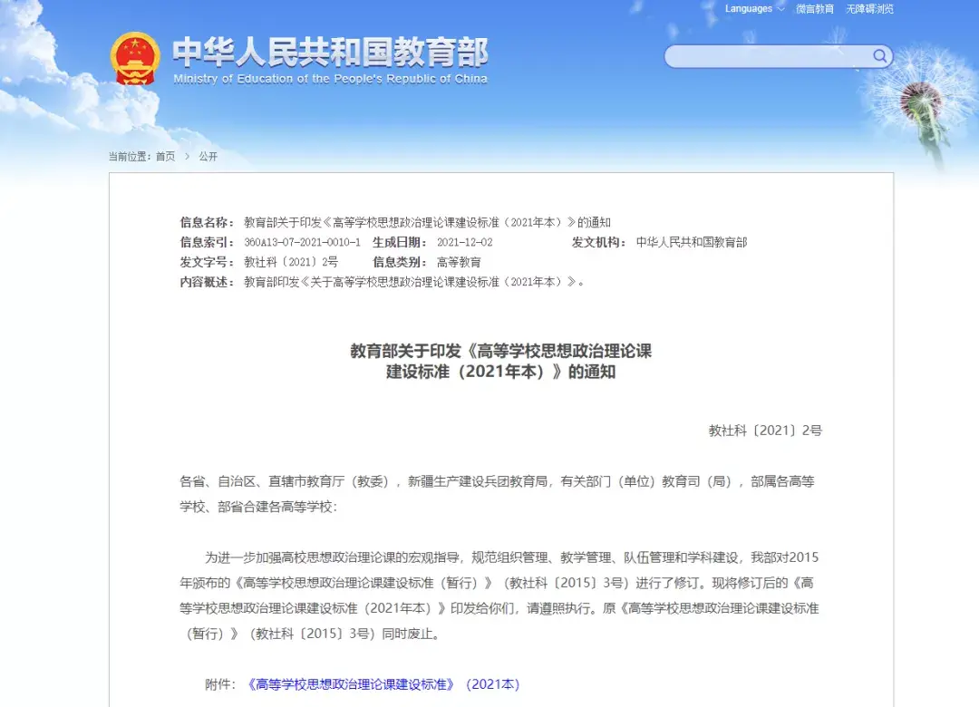 为进一步加强高校思想政治理论课的宏观指导,规范组织管理、教学管理、队伍管理和学科建设,我部对2015年颁布的《高等学校思想政治理论课建设标准(暂行)》(教社科〔2015〕3号)进行了修订。现将修订后的《高等学校思想政治理论课建设标准(2021年本)》印发给你们,请遵照执行。原《高等学校思想政治理论课建设标准(暂行)》(教社科〔2015〕3号)同时废止。