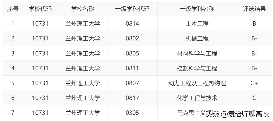 在第四轮学科评估中,兰州理工大学最好的学科为土木工程,被评为B,另有三个学科被评为B-,共有七个学科上榜,具体可见下图!
