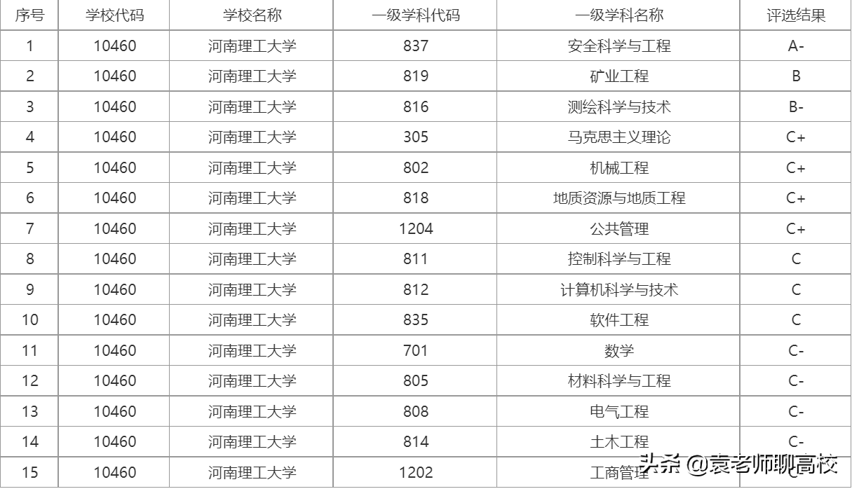 在第四轮学科评估中,河南理工大学最好的学科为安全科学与工程,被评为A-,另有矿业工程被评为B,共有15个学科上榜,具体可见下图!