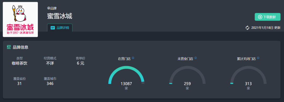 截至1月18日,蜜雪冰城已在全国31个省份(含直辖市)346座城市拥有门店13087家,另有259家未营业,累积关闭门店313家。
