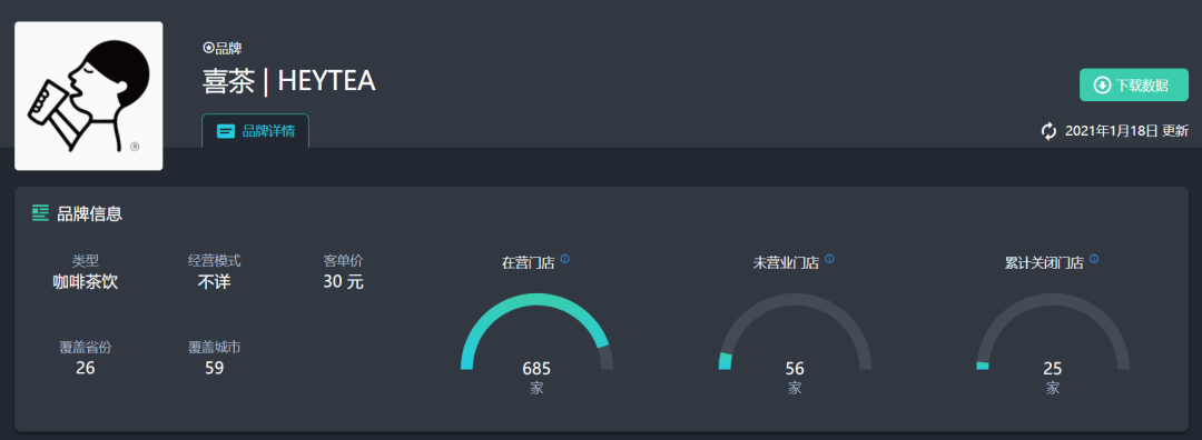 截至1月18日,喜茶在全国26省份(含直辖市)59座城市,拥有门店685家且全部直营,且56家门店未营业,累积关闭门店25家。这个增速非常惊人。