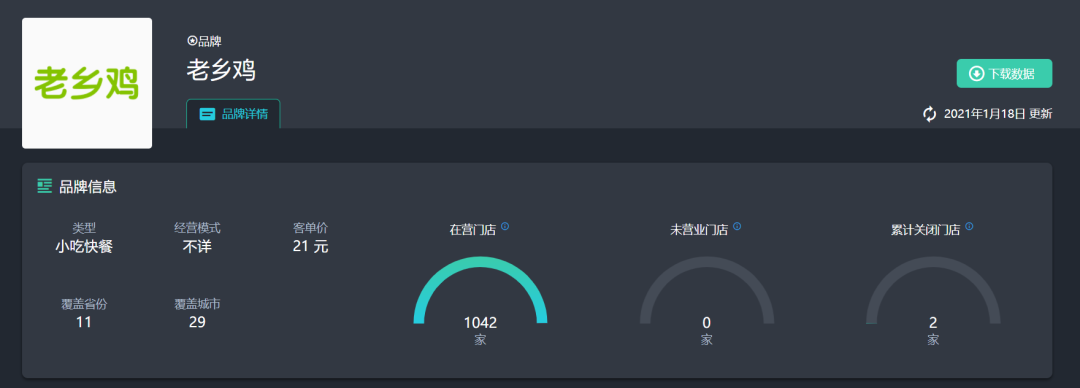 截至1月18日,老乡鸡已经在全国11省份(含直辖市)29座城市拥有门店1042家,且全部直营,累积关闭门店仅2家。