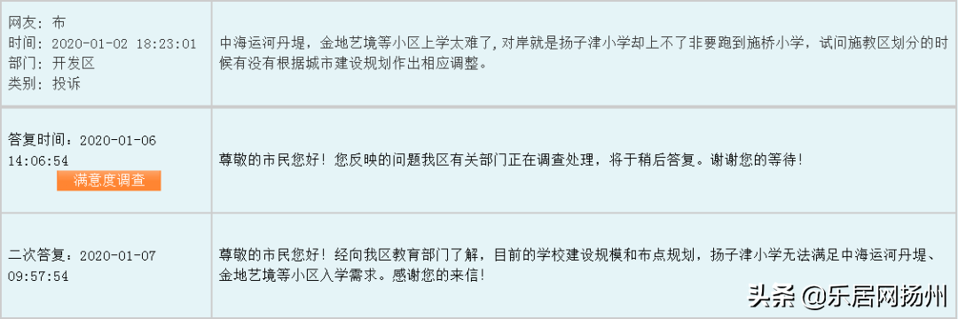 从他的留言中,可以推断出,他家的小学学区为扬子津小学,中学学区为扬州经济技术开发区实验中学。