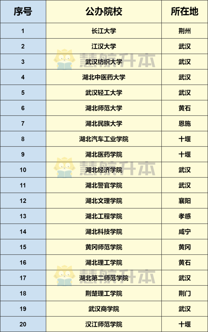 2022年,湖北专升本共有20所公办院校招生,其中8所位于省会武汉,其他12所院校,分布于其他县市。