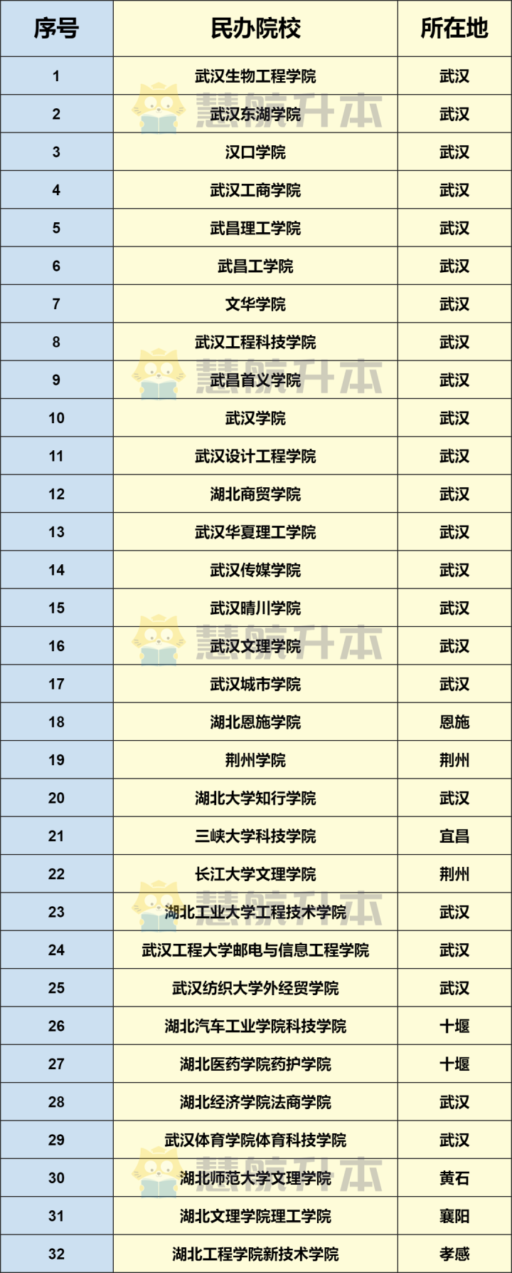 除去公办院校,还有32所民办独立院校专升本招生,其中23所位于武汉,其他9所院校分布于省内其他县市。