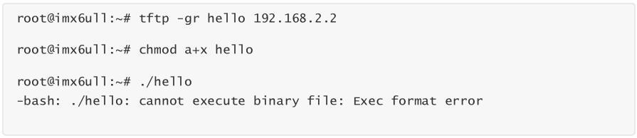 我们将该程序下载到开发板上运行试试看,这时系统会提示可执行文件格式出错,不能正常运行。