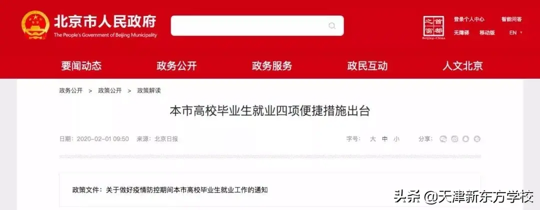 北京市人力社保局与市教委联合发布《关于做好疫情防控期间本市高校毕业生就业工作的通知》,出台暂停现场招聘、鼓励线上服务、简化就业手续、推迟业务办理时间四项高校毕业生就业安全便捷举措。