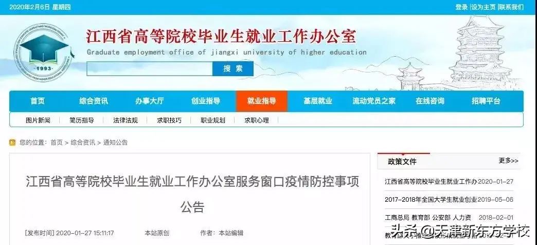 此外,2月3日,江西省高校毕业生就业工作办公室印发通知,要求各高校暂停一切现场招聘活动,创新就业工作方式方法,大力开展网络智能化就业服务,开展线上就业教学指导,简化和优化就业手续,制订就业工作疫情防控预案,做好疫情防控期间的就业服务工作。