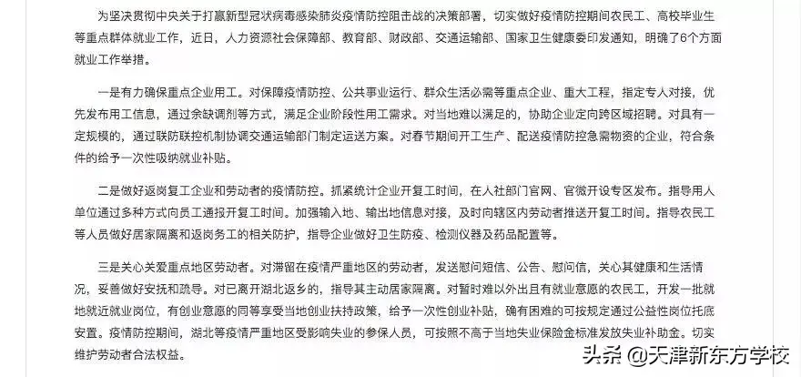 2020年毕业生签署就业协议书开始时间推迟到3月1日,结束时间延至12月31日;延长就业报到、求职创业补贴办理时间;视疫情变化情况,适时启动乡村教师特岗计划、乡村振兴协理员招聘工作。
