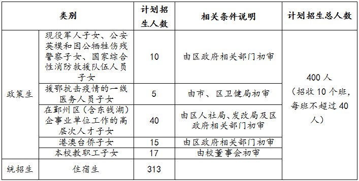 计划招收七年级新生共180人,6个班级,每班30人,实行小班化教学。实施分类招生,其中本校教师子女2人,宁波大学教师(博士或副教授及以上)子女10人,其他168人。