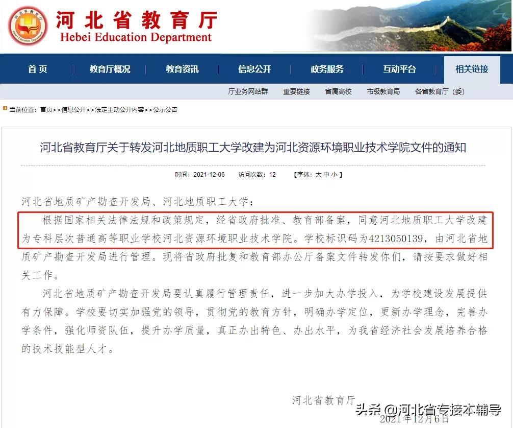 日前,从河北省教育厅了解到,河北省教育厅发布通知:根据国家相关法律法规和政策规定,经省政府批准、教育部备案,同意河北地质职工大学改建为专科层次普通高等职业学校河北资源环境职业技术学院。