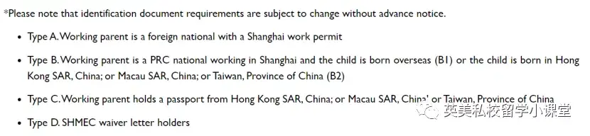 学生和家长持有外国护照和有效中国工作签证(Z)及相应的家属签证。学生和家长持有港澳台护照以及回乡证、台胞证。持有外国护照和家庭团聚(Q1)签证的家庭。持有中国护照和外籍永居身份的家庭,并有效证明在海外生活至少一年时间。明星子女代表:等等