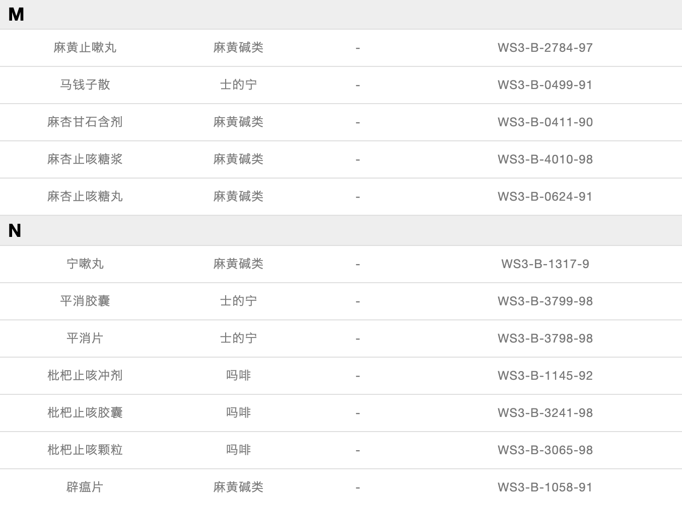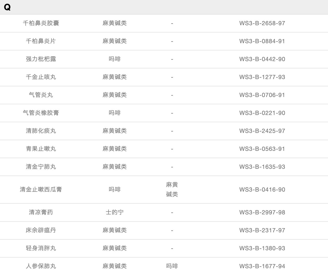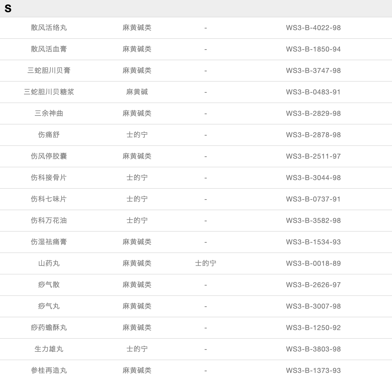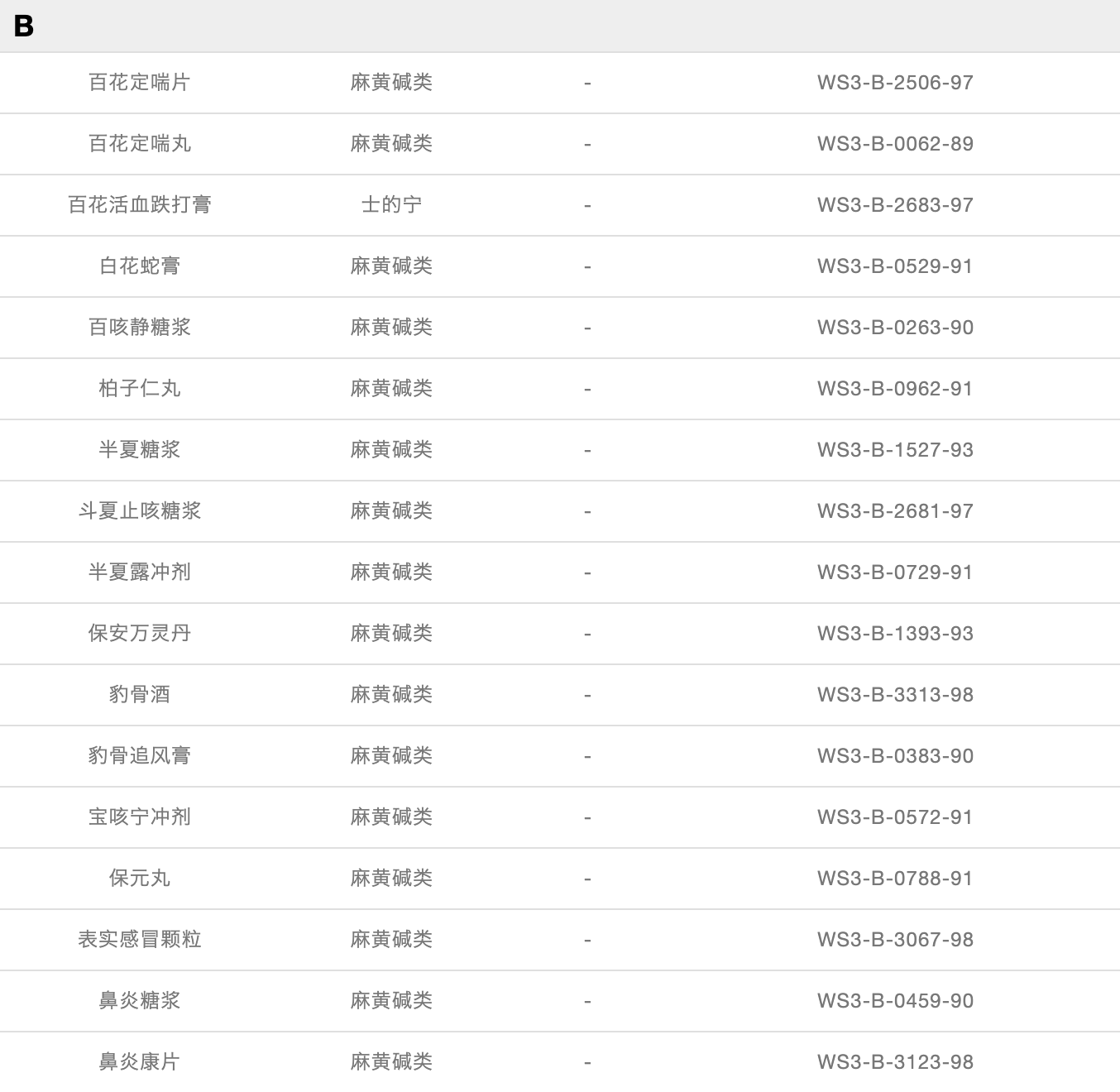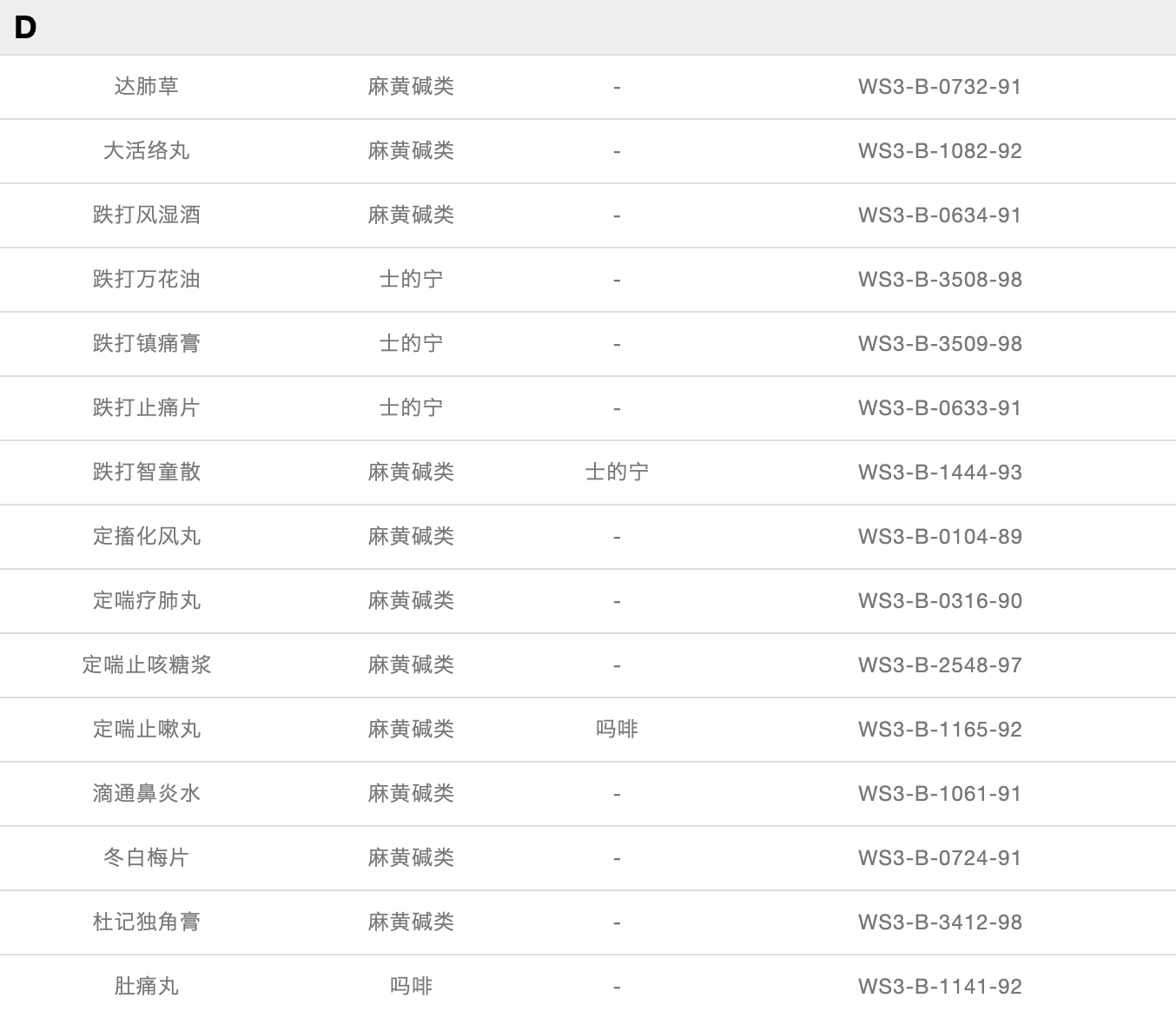 目前国际奥委会(IOC)规定的禁用物质黄碱、伪麻黄碱、去甲麻黄碱、去甲伪麻黄碱、甲基麻黄碱、咖啡因、可卡因、士的宁、吗啡、大麻二酚、大麻酚、四氢大麻酚和甘露醇。2008年03月14日国家食品药品监督管理局发布了含有兴奋剂目录所列物质药品名单的通知,并在国家食品药品监管局公布了名单,其中化学药品及生物制品773种,中成药1231种,占我国现有中成药品种的24%。