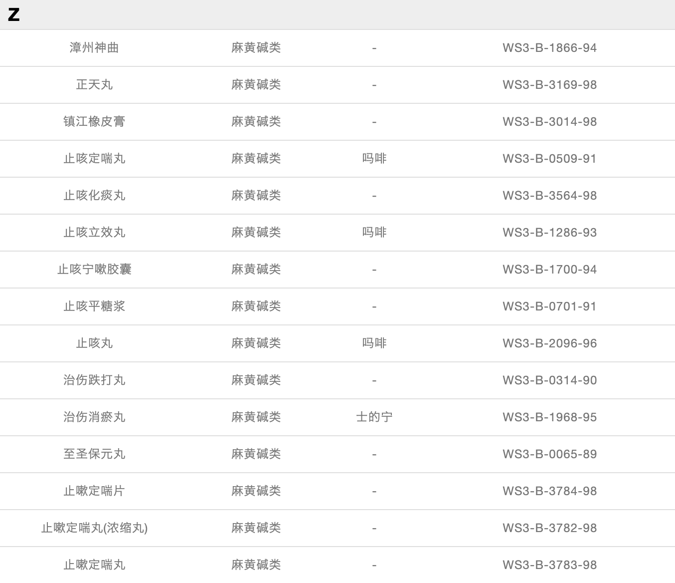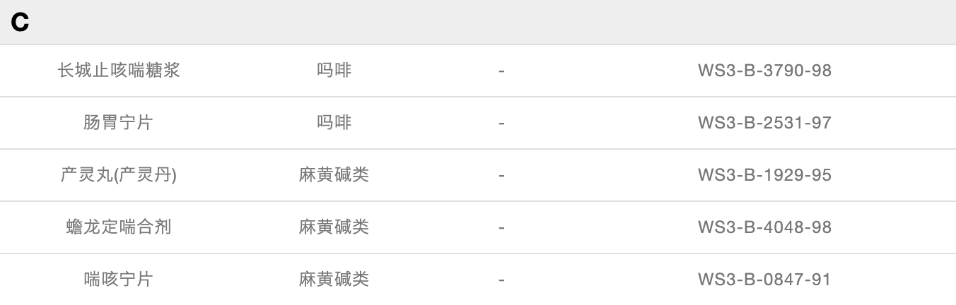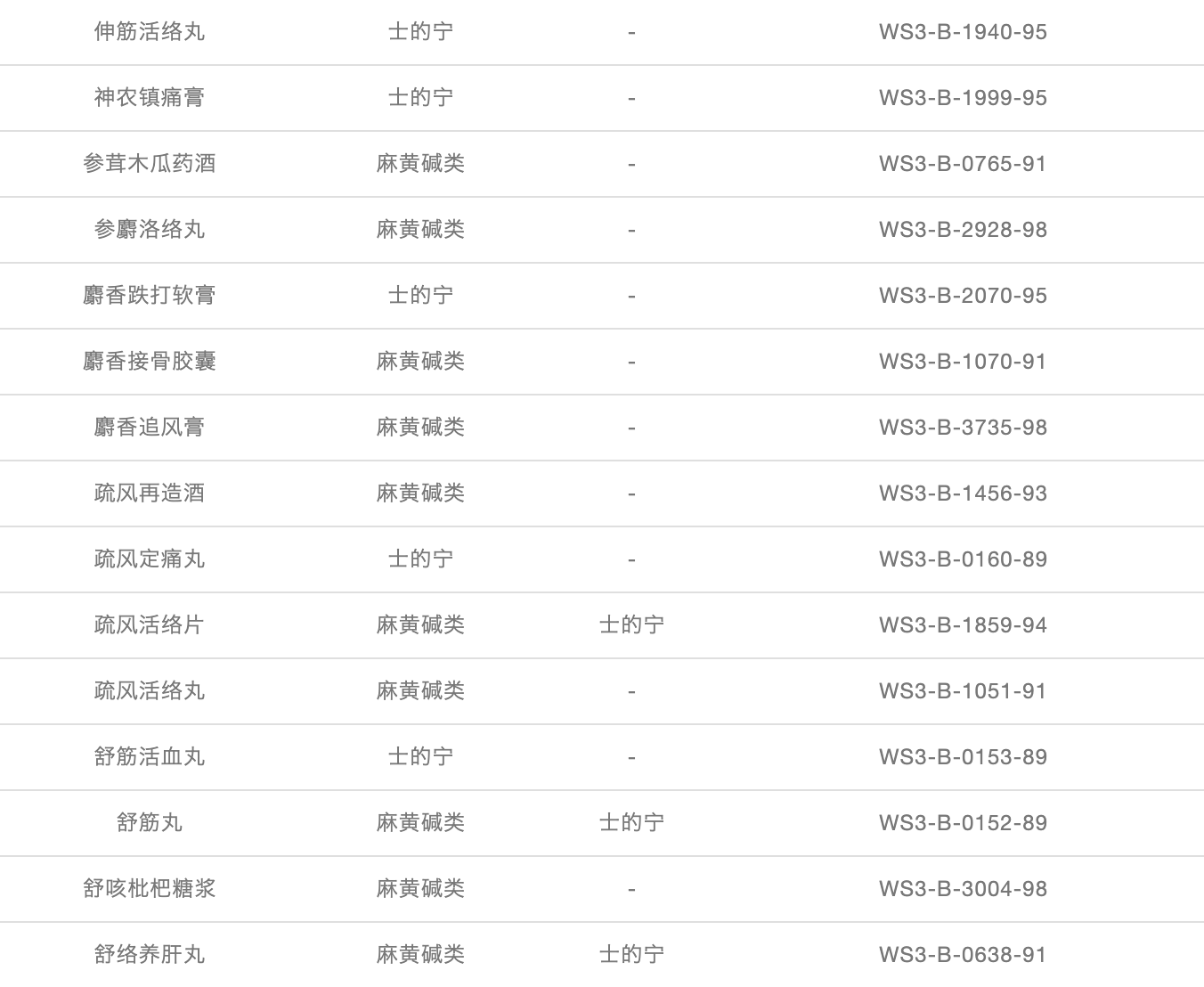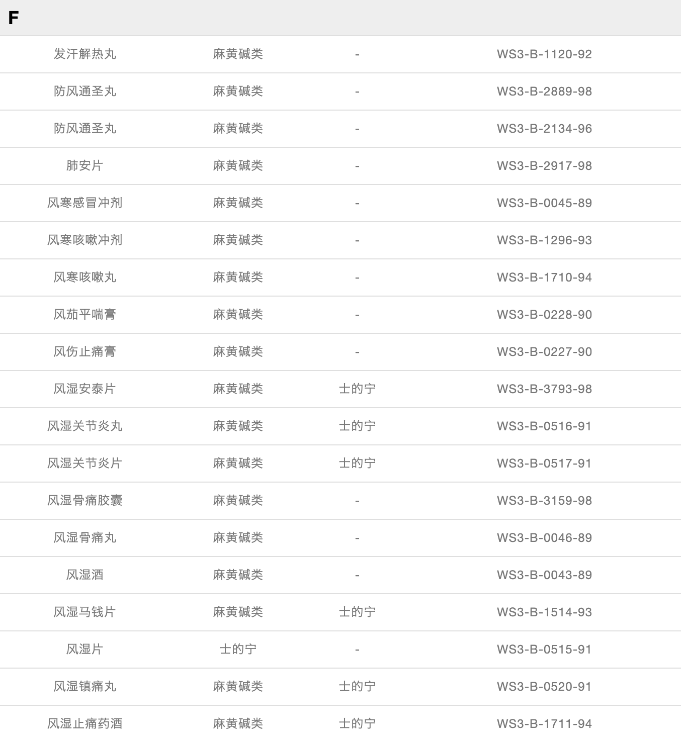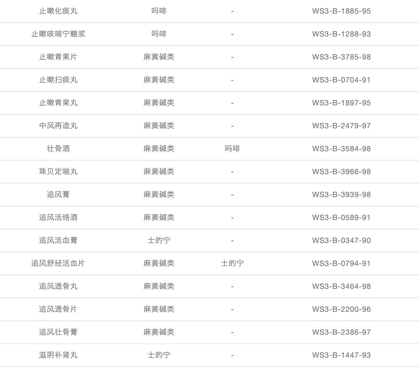 目前国际奥委会(IOC)规定的禁用物质黄碱、伪麻黄碱、去甲麻黄碱、去甲伪麻黄碱、甲基麻黄碱、咖啡因、可卡因、士的宁、吗啡、大麻二酚、大麻酚、四氢大麻酚和甘露醇。2008年03月14日国家食品药品监督管理局发布了含有兴奋剂目录所列物质药品名单的通知,并在国家食品药品监管局公布了名单,其中化学药品及生物制品773种,中成药1231种,占我国现有中成药品种的24%。