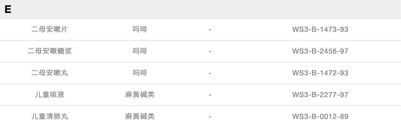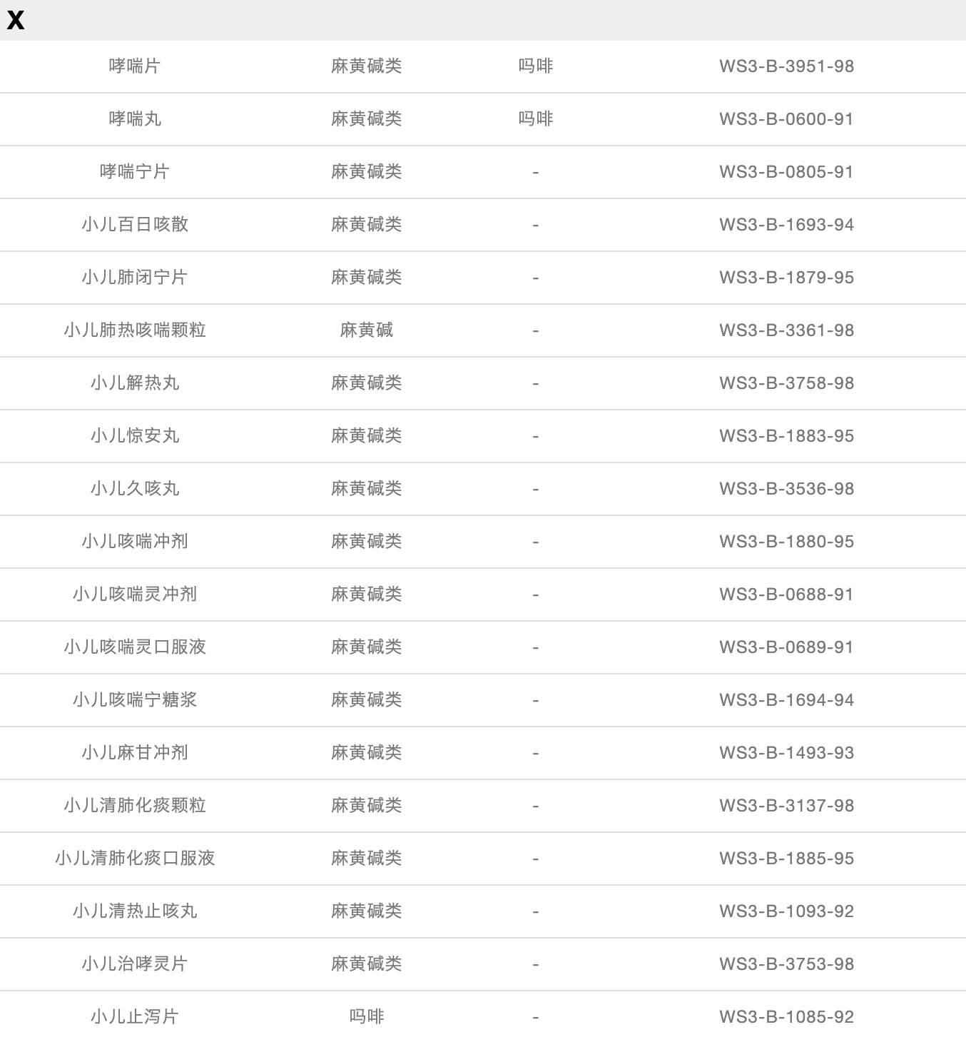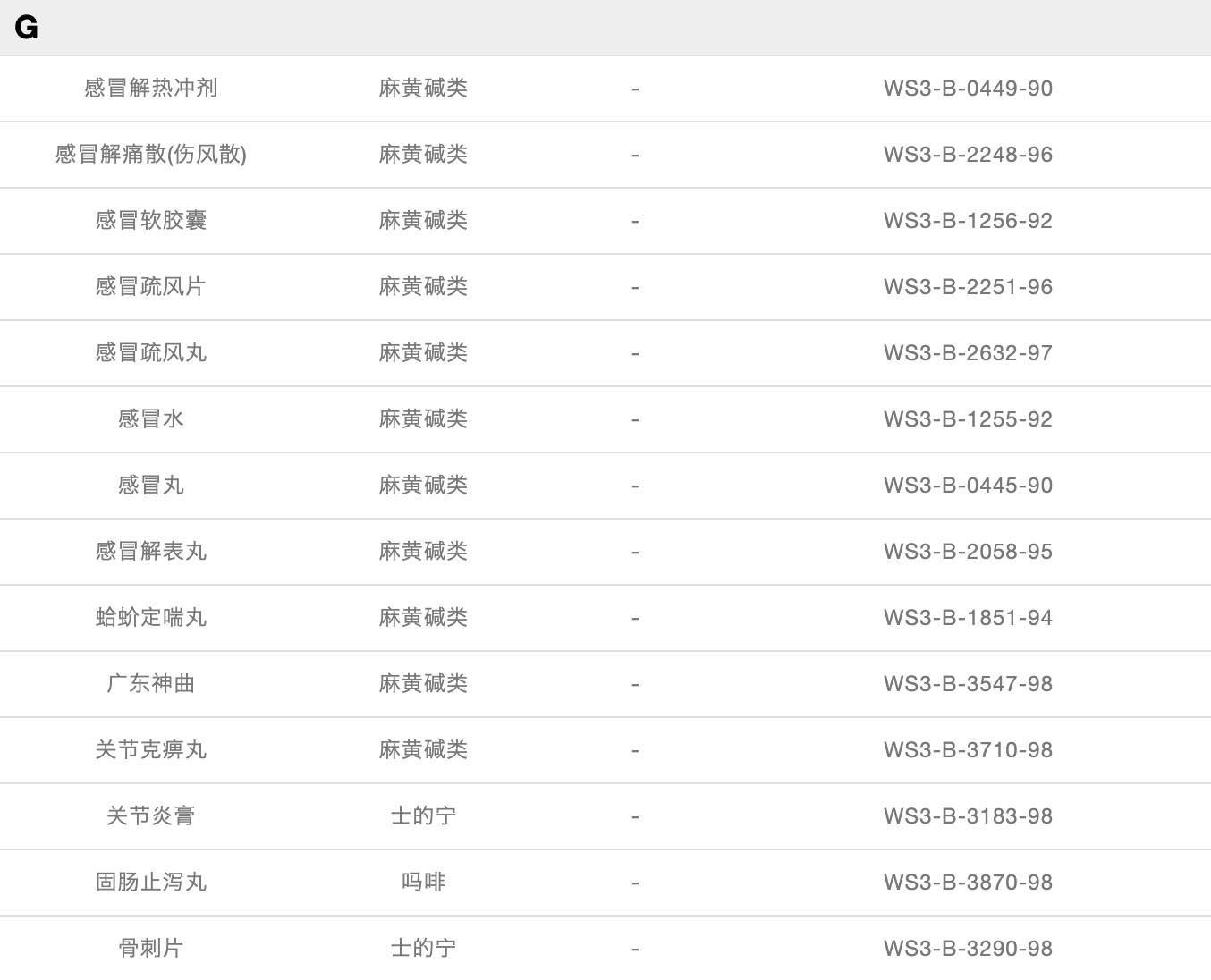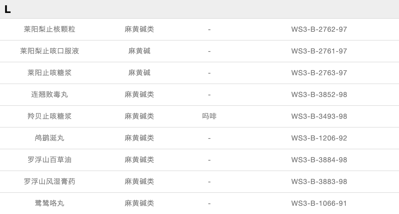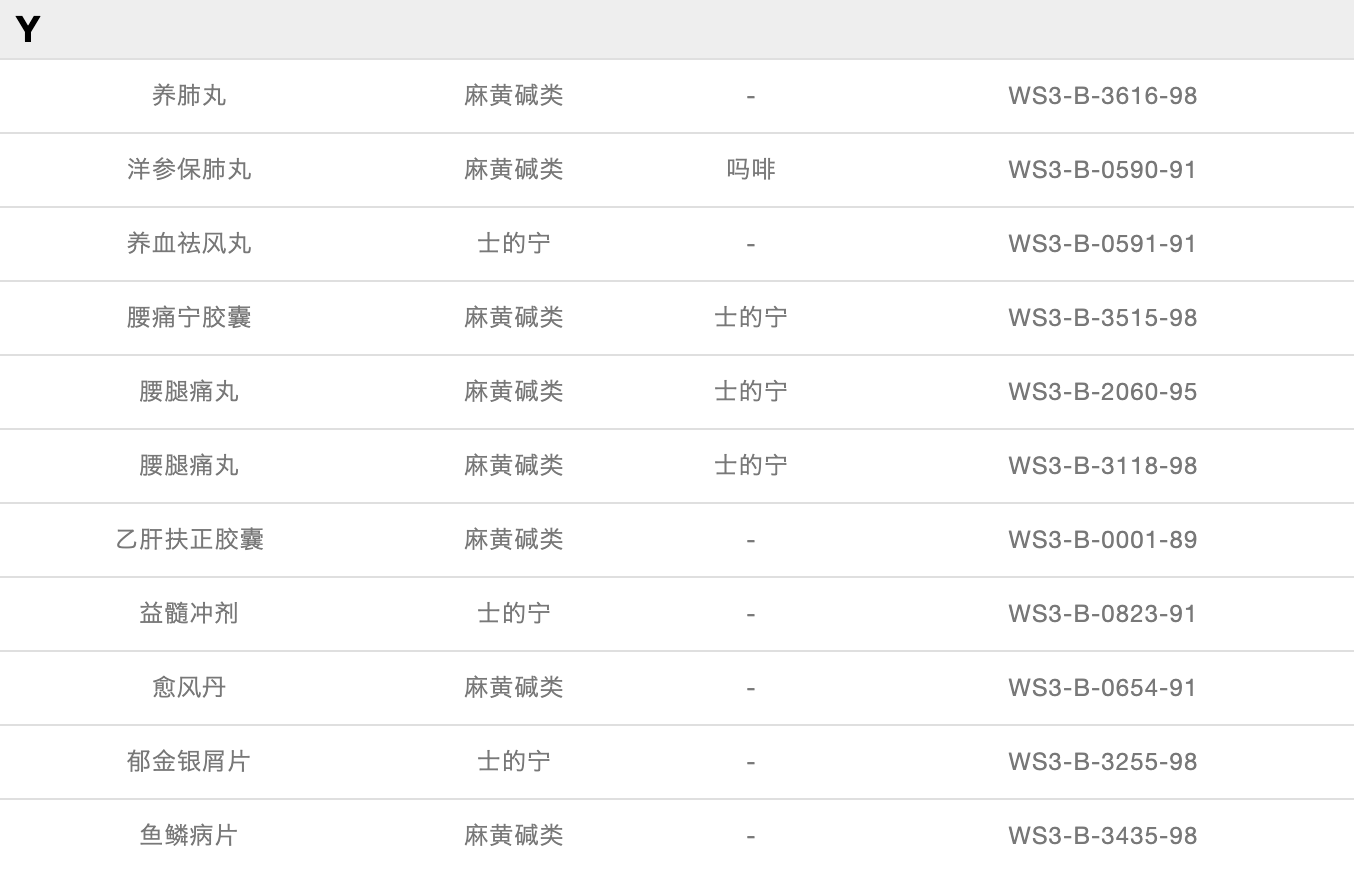 目前国际奥委会(IOC)规定的禁用物质黄碱、伪麻黄碱、去甲麻黄碱、去甲伪麻黄碱、甲基麻黄碱、咖啡因、可卡因、士的宁、吗啡、大麻二酚、大麻酚、四氢大麻酚和甘露醇。2008年03月14日国家食品药品监督管理局发布了含有兴奋剂目录所列物质药品名单的通知,并在国家食品药品监管局公布了名单,其中化学药品及生物制品773种,中成药1231种,占我国现有中成药品种的24%。