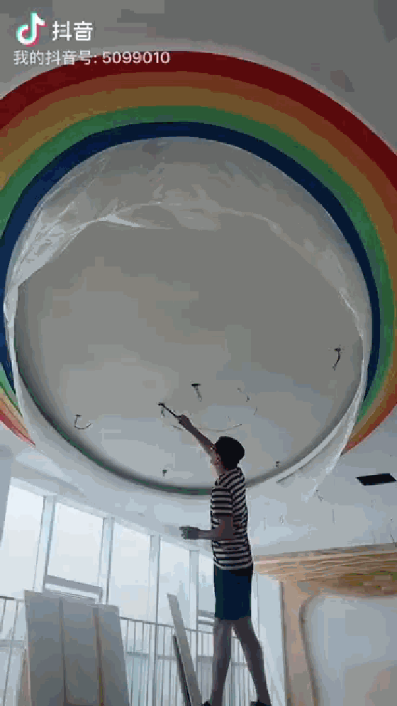 这一个月里为了画屋顶,我每天踩在高凳子上面仰着脖子、举着胳膊,暑假的时候天气还特别热,每天回家衣服都湿透了,但是一想到孩子们开学以后推开门,看到满屋子的星空,想到他们的兴奋,我觉得一切都是值得的,我很开心。