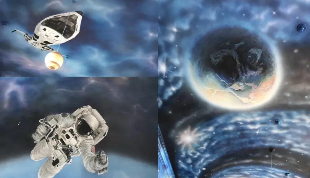 就这样,又过了几天,迎来了2019年的暑假。暑假来临前,校长提议让我用画装饰一下科技教室的屋顶。我想了一下,装饰屋顶的话需要抬头看,抬头看的只有三种可以画,蓝天白云、夜晚的星空,还有浩瀚的宇宙,似乎宇宙最有科技感;正好当时电视剧《小欢喜》热播,里边的英子特别喜欢星空。经过一个月的思考琢磨,我开始画《星空穹顶》。