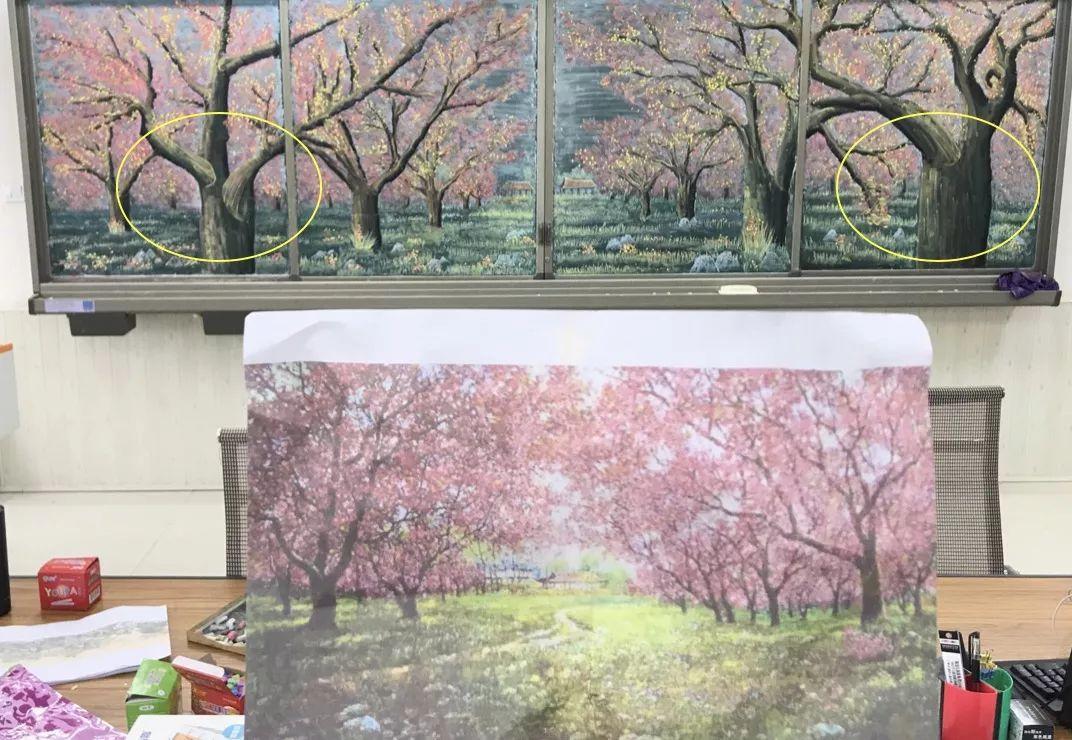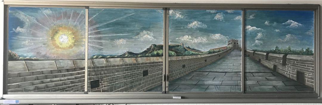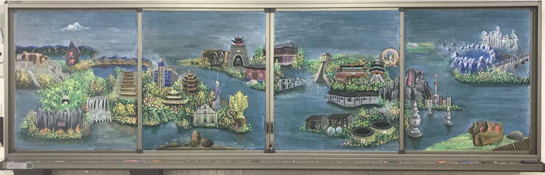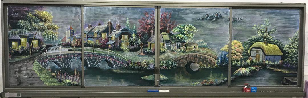 拼画倒是不难,难的是颜色太丰富,每一块的颜色都不一样,画起来特别费事儿。因为油画颜色特别鲜艳,粉笔要画很多遍才能达到相近的效果。当国画风格和油画风格的粉笔画都画完以后,我的心里边儿特别高兴,感觉自己为现在有限的美术教学做了一点贡献。