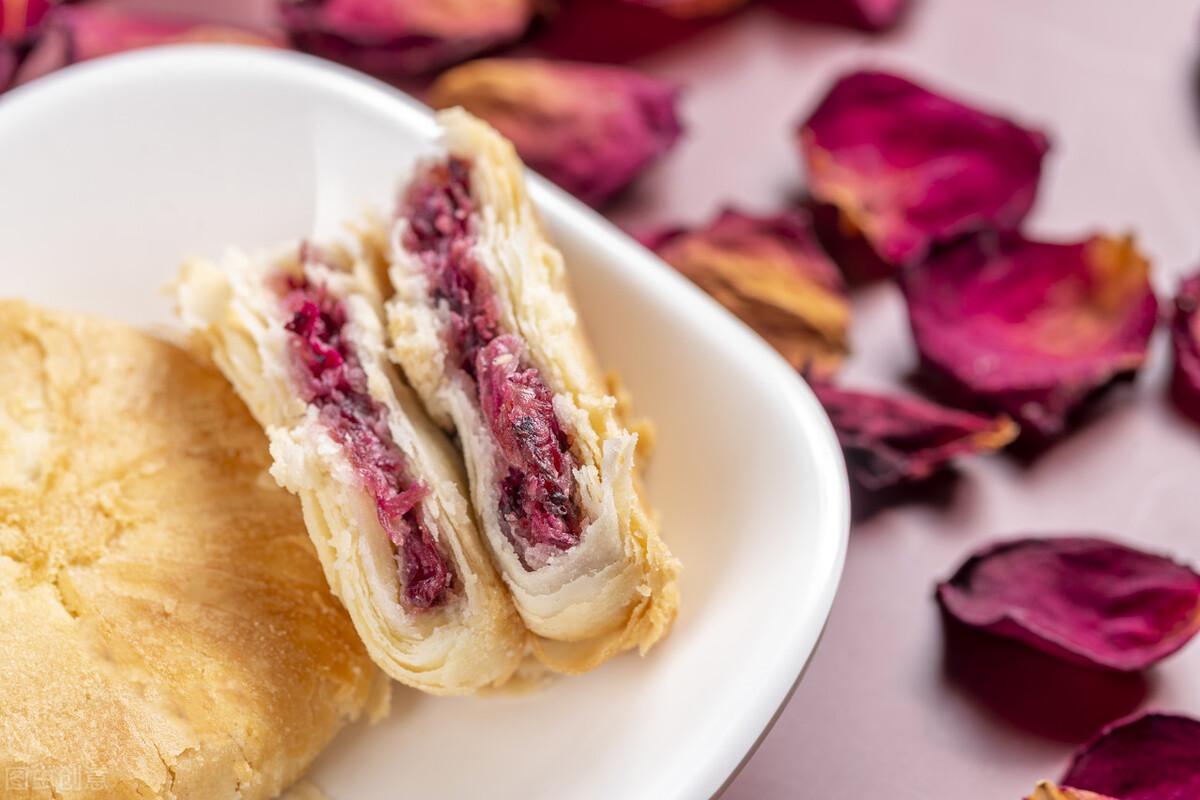 鲜花饼是一款以云南特有的食用玫瑰花为原料的酥饼,以面粉、玫瑰,玉兰、菊花等为主要原料的小吃。