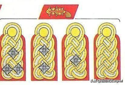 将官将官肩章的底板为红色,宽度为4cm左右,将官的肩章跟校官肩章差不多,将官肩章是有三根金属丝线组成,中间一条为银色金属丝线,两边分别由一条金色金属丝线组成(就像三明治)。两根金属丝线相互缠绕扭麻花的样式,在肩章两边形成4条金属线圈环,同样在肩章与制服的纽扣处还有一个线圈,肩章上的军衔星是银色,衔星的大小在2.8-3.8cm左右;将官的领章底板和元帅的领章都也是红色的上面的图案是德国国花“矢车菊”,矢车菊是德国的国花,象征着日耳曼谨慎与虚心学习的精神,更能彰显出德国军人的敢于挑战,永不服输,顽强,爱国,忠诚的积极奋进精神。