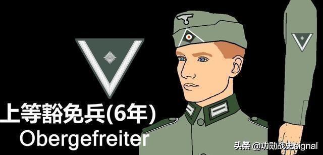 参军两年后的豁免兵,如果特别优秀或者有战功表现那就会晋升为上等豁免兵(Obergefreiter)袖臂上带双V字表示。上等豁免兵(Obergefreiter)