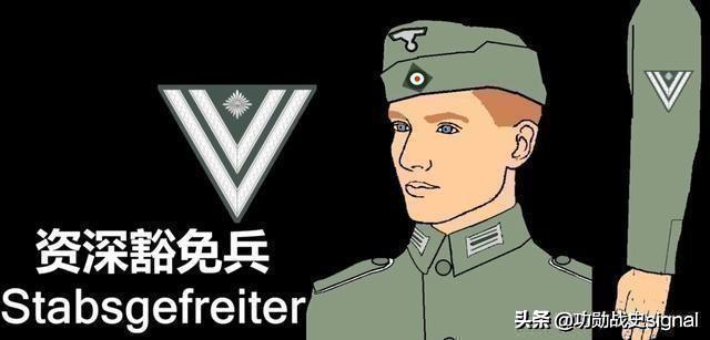德军士兵中最高的军衔是资深豁免兵(Stabsgefreiter)这个军衔是给参军5年以上,至少有两年是上等豁免兵的士兵,也就是资历够却没有办法晋升的士兵,给予老兵最高级的称谓。通常这类士兵属于老兵油子了一般会在到后勤单位。资深豁免兵(Stabsgefreiter)