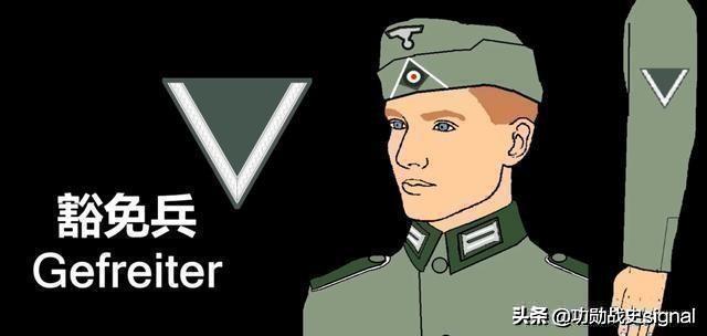 列兵通常在参军一年后各项考核达标后就会晋升为豁免兵(Gefreiter)袖臂上带V字袖标表示所在的等级,士兵的肩章领章采用布质底板,在肩章和领章上有兵种色的边线是来区别陆军各个兵种。待遇和资历自然是比列兵要好咯(你懂得)豁免兵(Gefreiter)