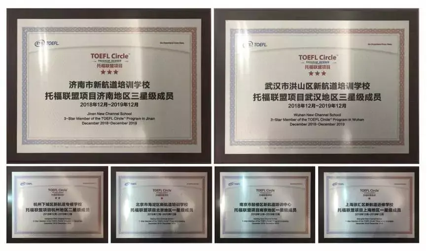 此外,新航道杭州学校荣获ETS托福联盟二星级合作伙伴,新航道北京学校、新航道上海学校、新航道南京学校荣获ETS托福联盟一星级合作伙伴。