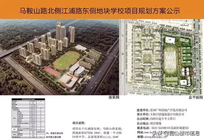 昆山高新区马鞍山路北侧、江浦路东侧项目规划方案公示,拟建设住宅社区及一所18轨54班中学,总建筑面积234623.32㎡。这一举措将进一步完善片区教育体系。