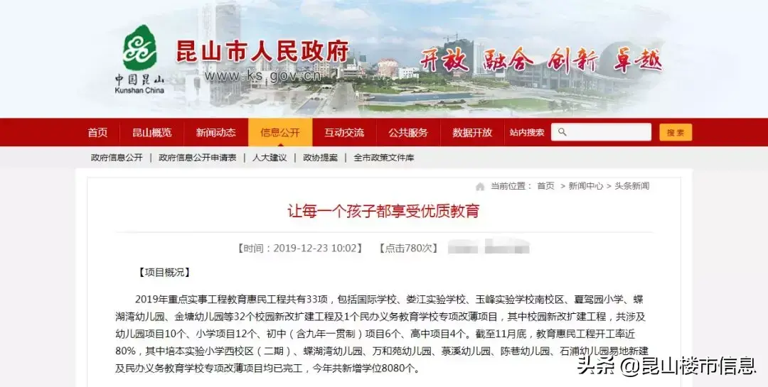 根据中国昆山网公布的数据,2019年重点实事工程教育惠民工程共有33项,包括国际学校、娄江实验学校、玉峰实验学校南校区、夏驾园小学、蝶湖湾幼儿园、金塘幼儿园等32个校园新改扩建工程及1个民办义务教育学校专项改薄项目,其中校园新改扩建工程,共涉及幼儿园项目10个、小学项目12个、初中(含九年一贯制)项目6个、高中项目4个。