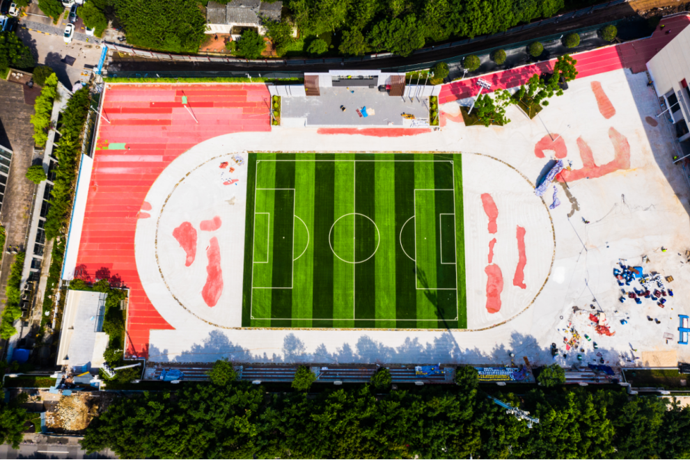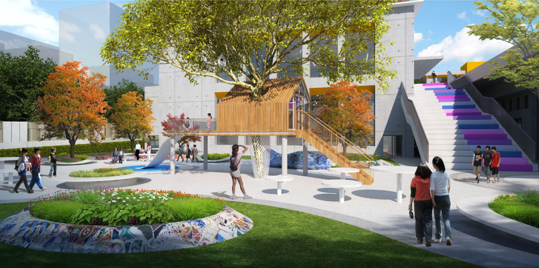 不仅教学楼、多功能报告厅、室内体育馆、室外体育场、图书馆、食堂、综合行政楼等标配一应俱全,同时以分层共享、垂直设计的形式,形成了功能的纵向迭进。