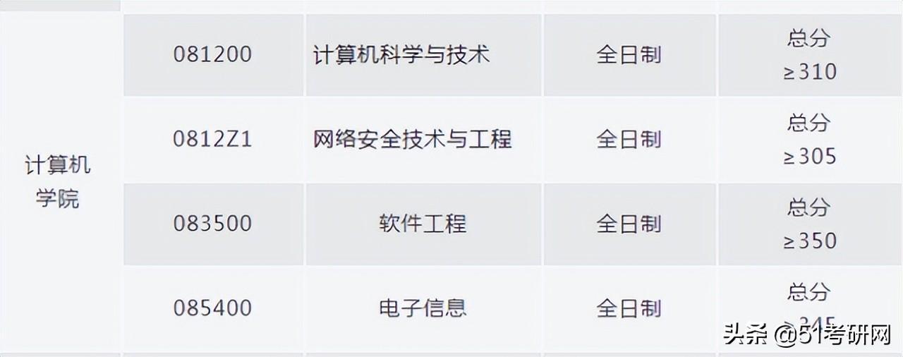 2021年计算机学院电子信息突然暴热,复试线直接涨了100分,由2020年的275分涨到375分,2022年稍有下降,电子信息复试线345分,软件工程学硕350分。
