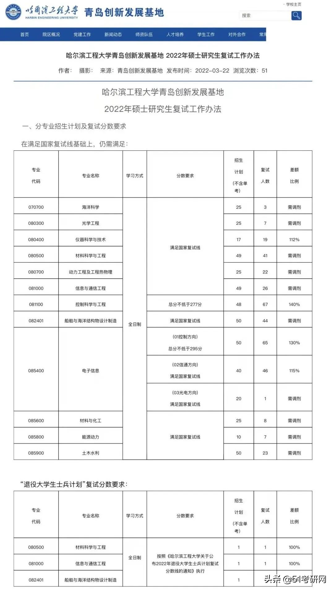 2022年各学院复试分数线、复试差额比及调剂专业