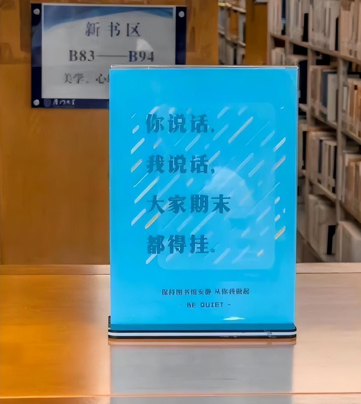 厦门大学图书馆标语走红,直白又不失幽默,网友建议全国普及。“你说话、我说话,大家期末都得挂”,看到这句善意的提醒,你还好意思在这里谈笑风生吗?“一口苹果青脆响,好多老鼠往这儿跑”,这句硬核提示,学生直呼太有画面感,手里的苹果瞬间不香了。“真的勇士,也不敢直面桌上震动的手机”,在一根针掉在地上都能听见的环境里,你还好意思让你的手机响起吗?赶紧静音吧,不仅静音,还要收起来,不要“面”见它!