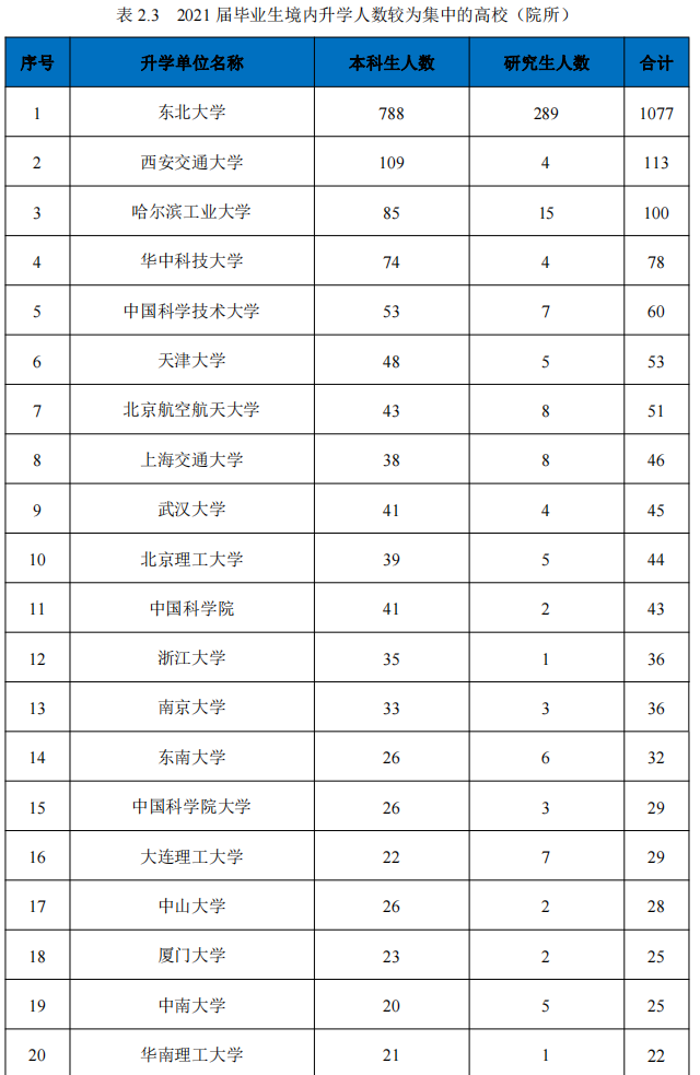 就升学而言,东北大学2021届本科毕业生升学比例为 47.4%,其中境内升学占42.6%,较上届提高2.3%,出国(境)留学占4.8%。研究生升学比例为9.7%,其中境内升学占9.1%,留学占0.6%。