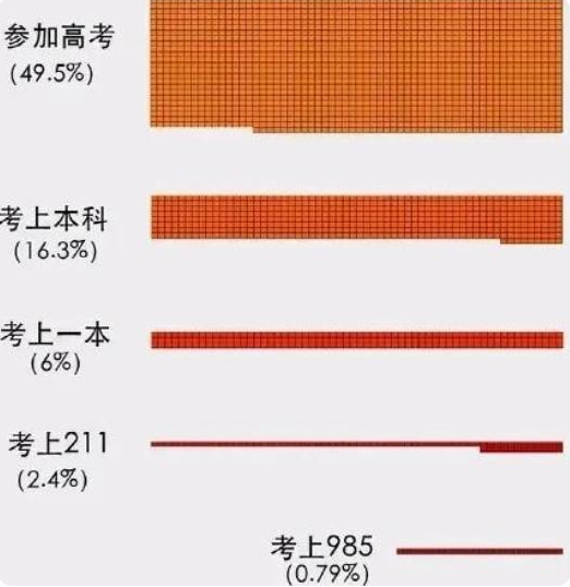 下图是全国高考适龄学生的分布图,可以看到通过中考这道分流程序,已经将51.5%的学生淘汰,只有49.5%的人能最终参加高考,最终只有16.3%考上本科,只有6%能考上一本,2.4%能考上211,0.79%能考上985.