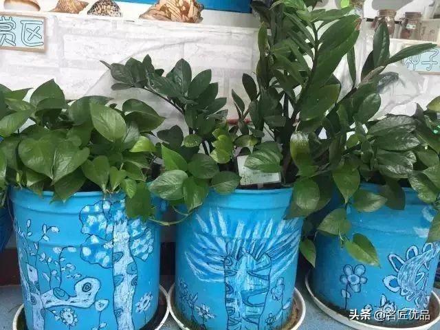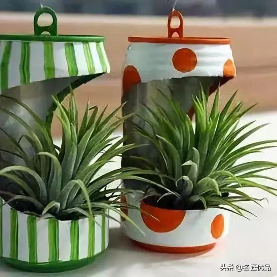 收集一些平时不需要的废旧易拉罐,在铁皮底部打几个花盆底洞,再给它们涂上好看的颜色,就变成了很好看的植物花盆,环保又美观!