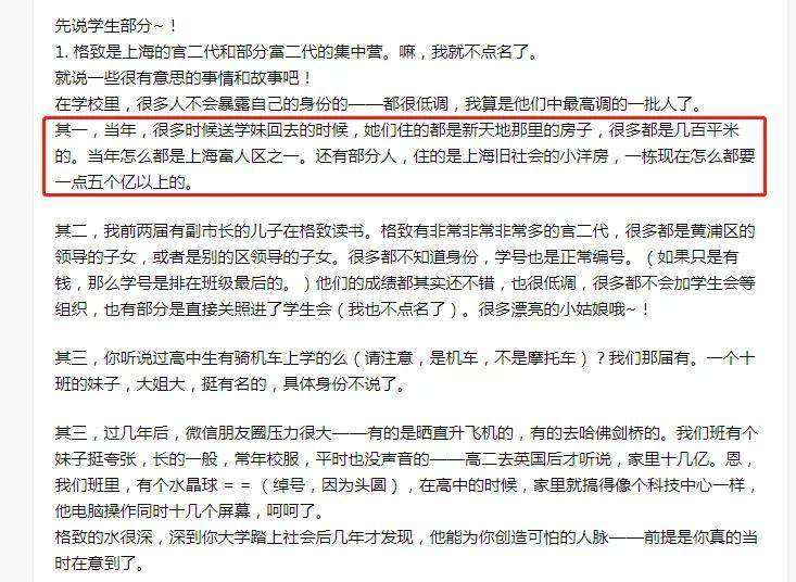 格致中学,黄浦区的百年老校,现有黄浦和奉贤两个校区。据说,能在这里就读的学生,都是非富即贵。