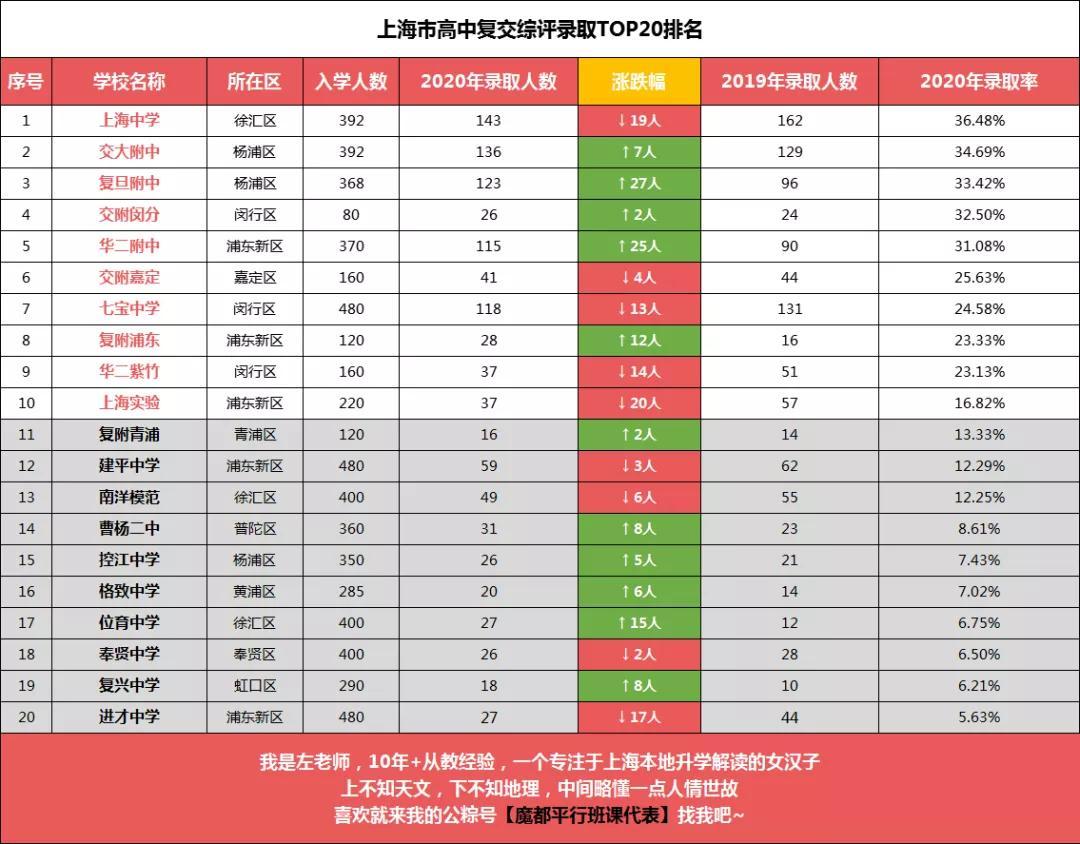 上次,左老师结合预录取的数据盘点了下上海公办初中的Top20排名,那么,今天这期文章,左老师就结合近2年的高中平行志愿分数线、复交综评录取人数和复交综评录取率,来给大家盘点下上海高中的Top20排名。