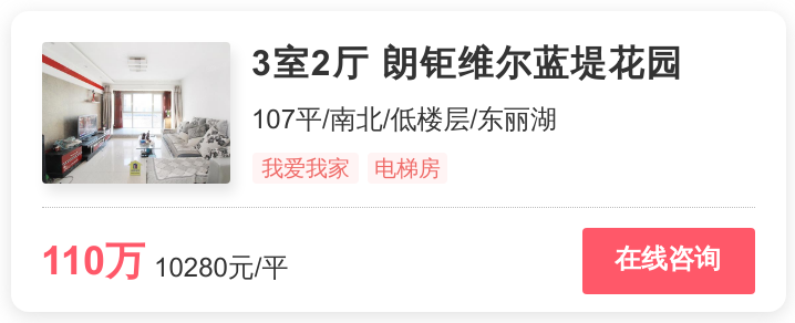 幸福里为你在东丽找到了位于詹滨西里社区、东丽湖万科城观湖苑、朗钜维尔蓝堤花园的3套非常抢手的低价三居室。以下将详细介绍这套位于朗钜维尔蓝堤花园,总价为110万的3居室。从小区层面上看,朗钜维尔蓝堤花园位于东丽湖。截止2020年3月,小区的均价为10941元/平方米,分别低于东丽湖商圈均价(13341元/㎡)2400元,低于东丽均价(17430元/㎡)6489元。从这套房源本身的卖点来看,而且,这套房源还有一个非常核心的优势,那就是这套房的楼龄很新,属于次新房。小区无论是在户型设计、物业配套还是整体环境上,都与新房无异。难怪,这套房最近这么受天津购房者关注。此外,该房源为舒适三居室,容纳全家人的幸福。有电梯,方便快捷,居住环境佳。点击以下房源卡片,即可查看房源照片及更多信息。