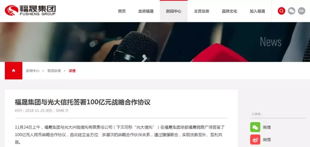 2018年11月24日,福晟集团与光大信托签署100亿元的《战略合作协议》。