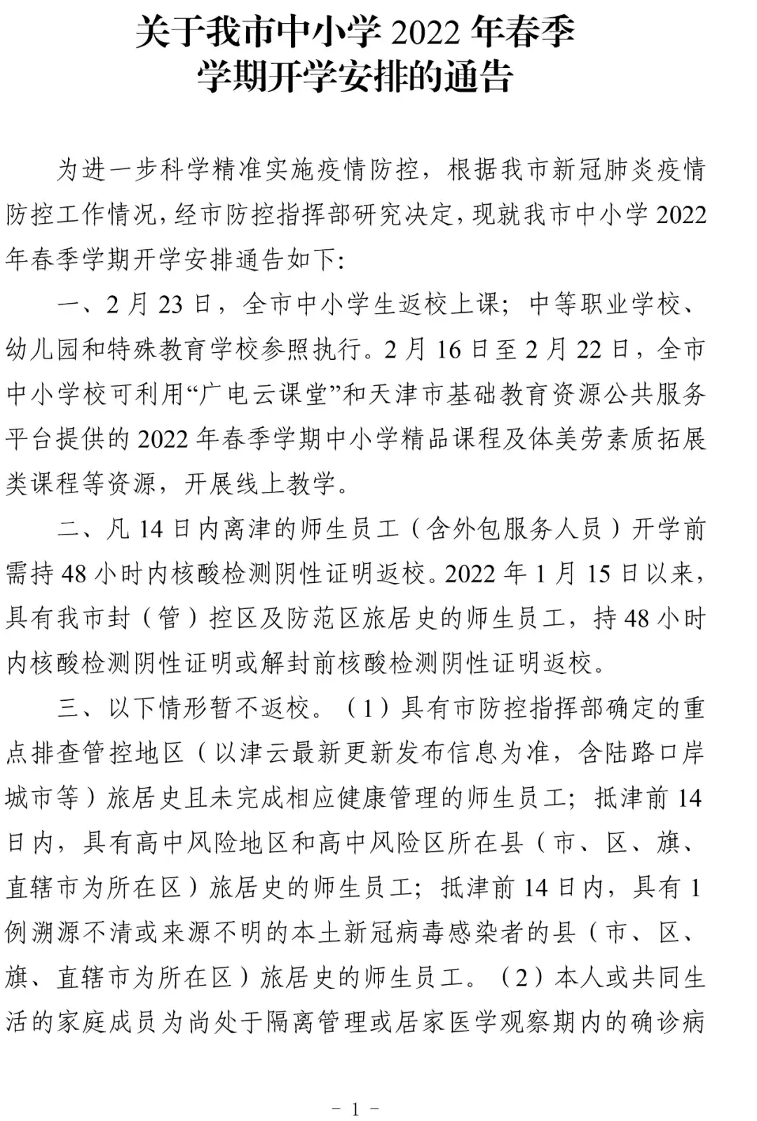 10日,“津门教育”微信公众号发布了关于我市中小学2022年春季学期开学安排的通告,2月23日,全市中小学生返校上课,全文如下:
