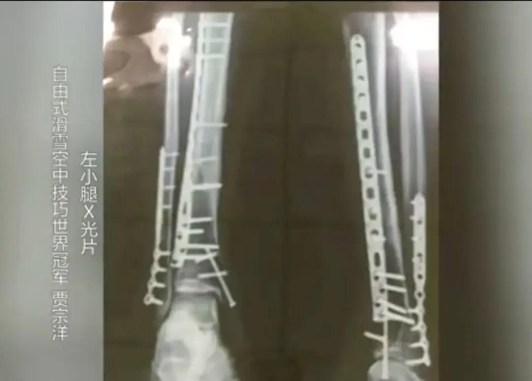 日前,一张贾宗洋左腿的X光片曝光,整整22根钢钉!
