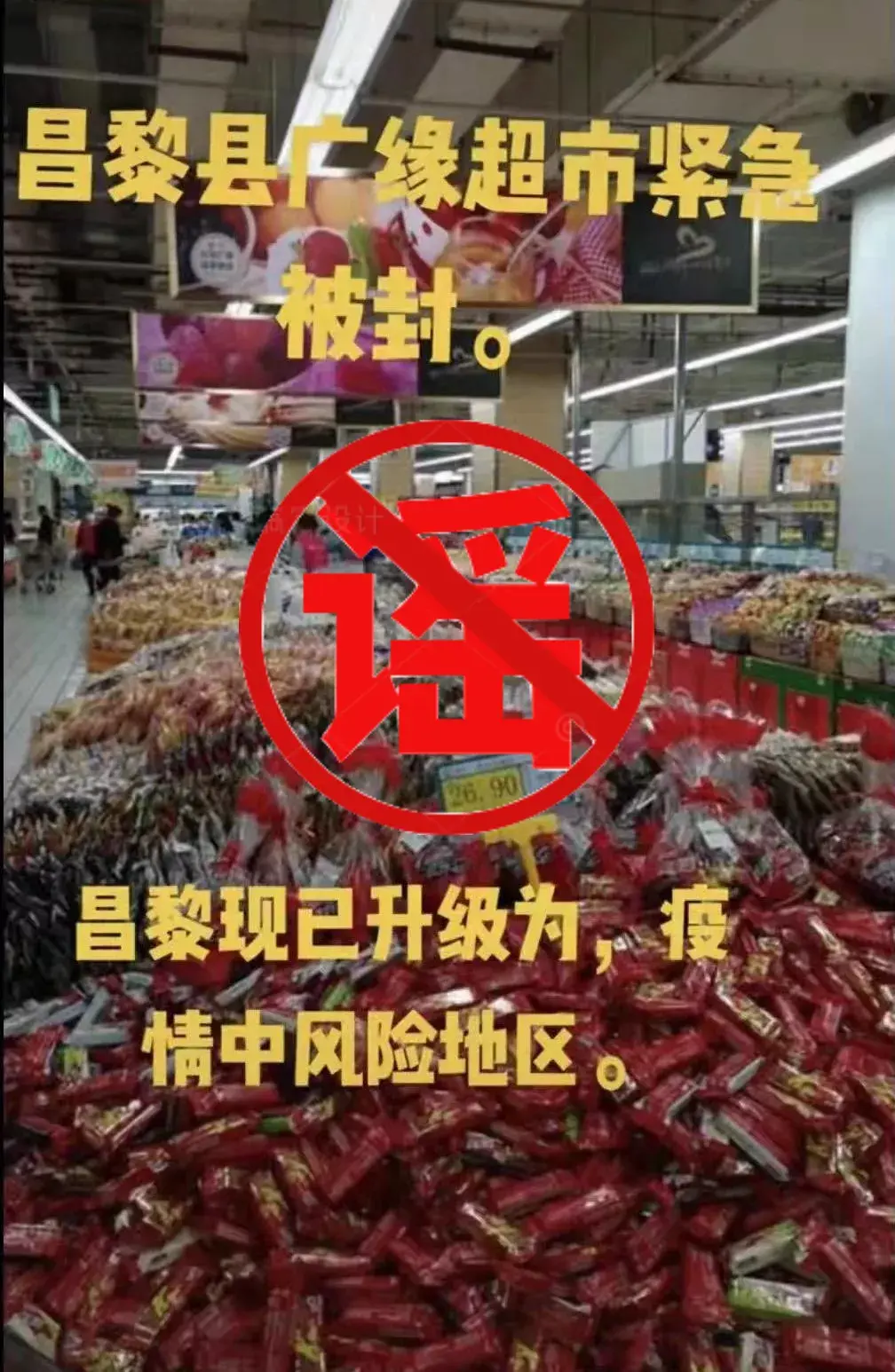 网传消息称“昌黎县广缘超市紧急被封,昌黎现已升级为疫情中风险地区”。该消息随后在网上传播,引发群众恐慌。