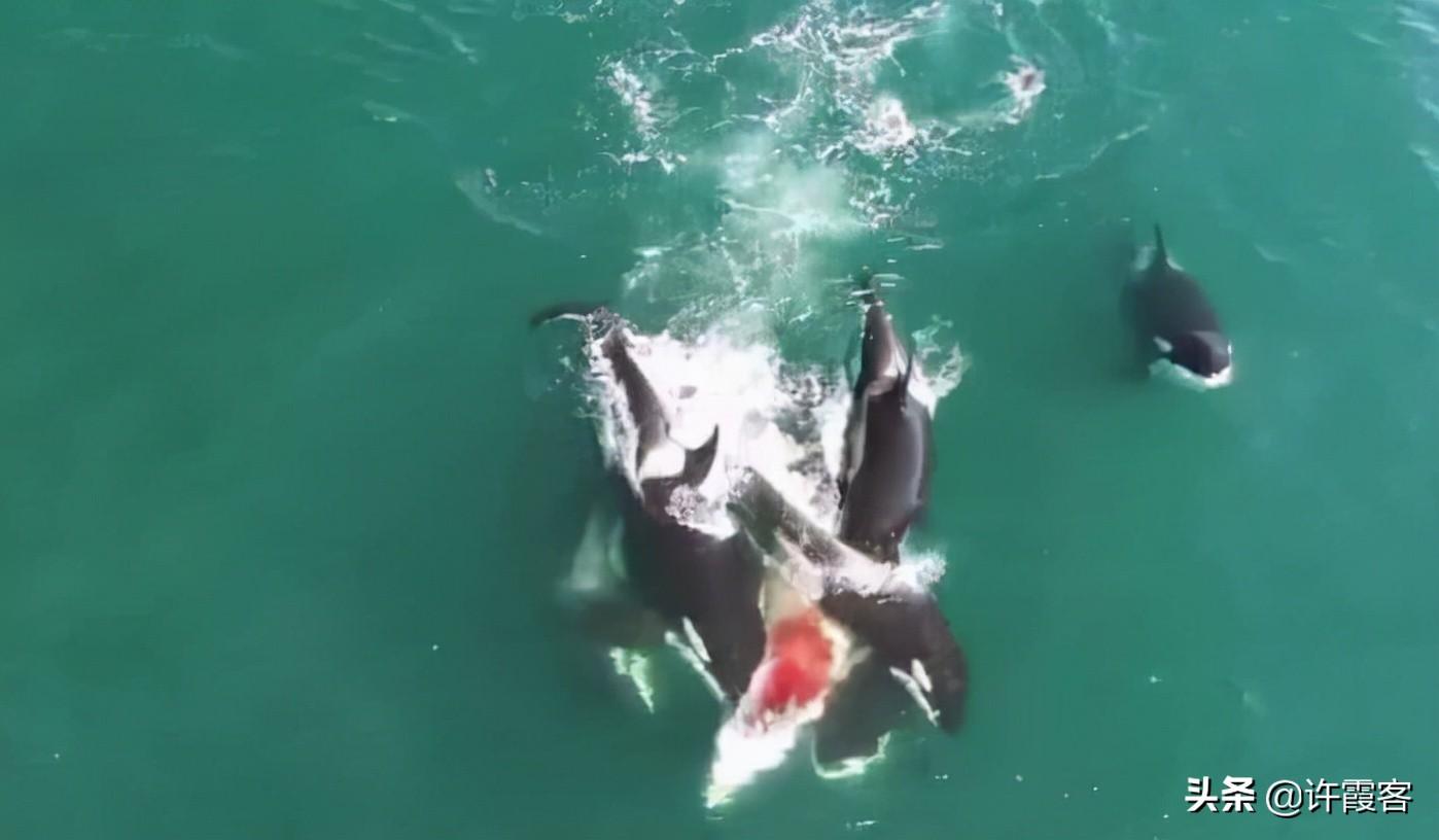 你现在看到的是一群虎鲸,它们猎杀并吃掉了这头巨鲸。虽然生命的循环有一些吸引人的地方,但这里的景色并不好看。