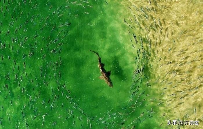 大自然永远不会缺少让我们惊奇的新事物。幸运的是,我们有无人机来捕捉像这条鲨鱼和它周围所有的鱼这样的重要时刻。这是多么难忘的时刻啊!