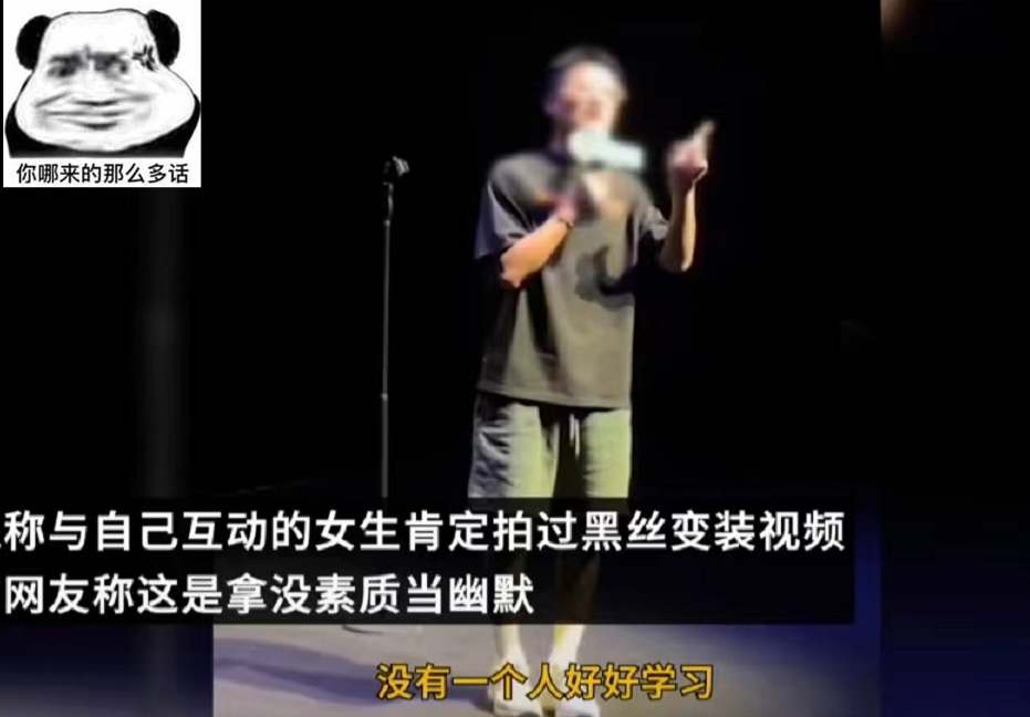 而且他还在表演时公然表示:西安外国语大学的女生对于学习不上心,而是喜欢“变装”,擅长打扮自己,还经常以“黑丝”示人,这样讽刺校内女生的话语让人听后不免有些刺耳。