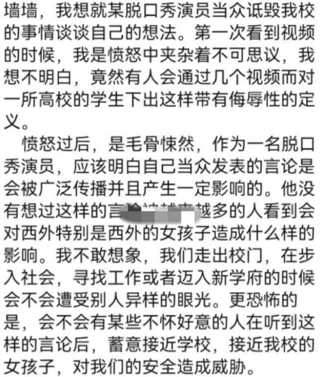 西外的很多学生对此为学校“鸣不平”,直言:现在脱口秀的门槛都这么低了吗?男演员发表言论之前都不打草稿的吗?面对这些非议,他本人也很快做出了回应。