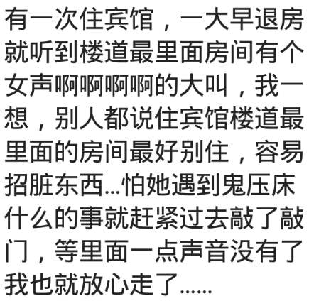 网友:带儿子出去玩,梦见有人半夜敲门,找服务员找不到,门都快被敲碎了,眼看坏人要破门而入,吓醒了!结果感觉隔壁房间咚咚的,仔细一听,妈的隔壁两口子啪啪动静太大导致床头不停碰撞墙面,两个房间的床头是隔壁,幸好儿子睡着了,要不儿子问我我都不知道咋回答!
