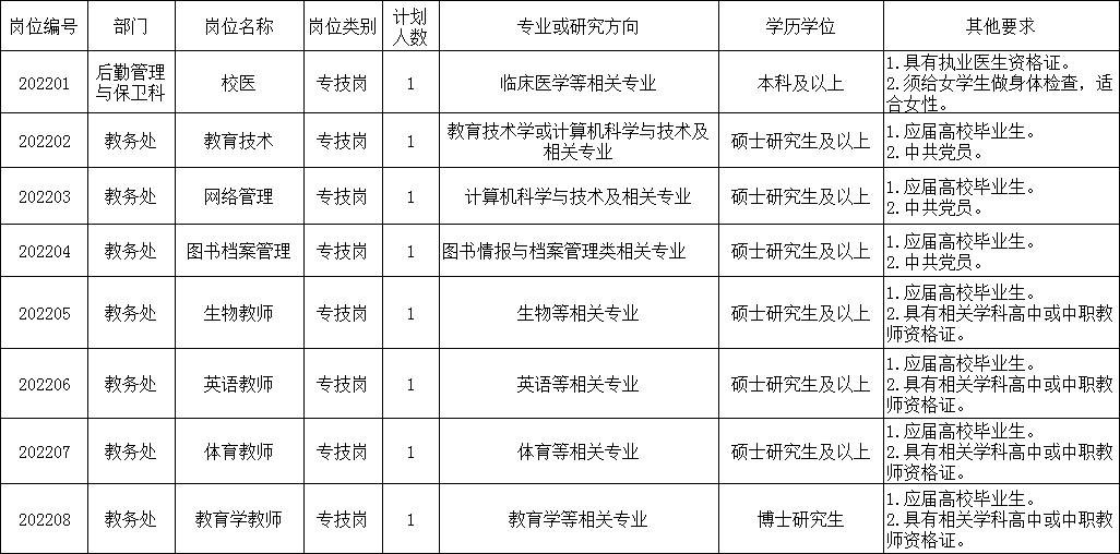 我校2022年拟招聘生物教师1名,英语教师1名,体育教师1名,教育学教师1名,校医1名,教育技术人员1名,网络管理人员1名,图书档案管理人员1名。